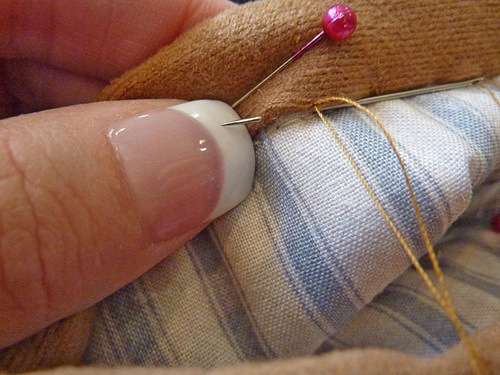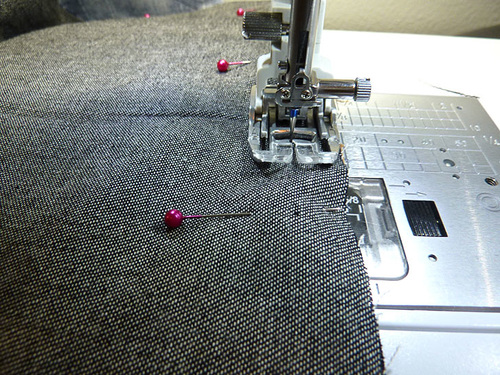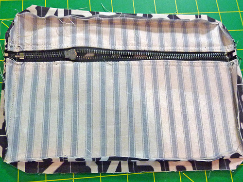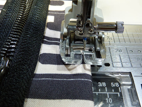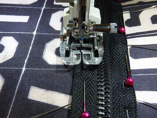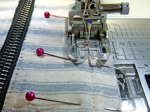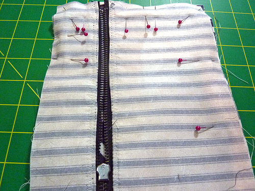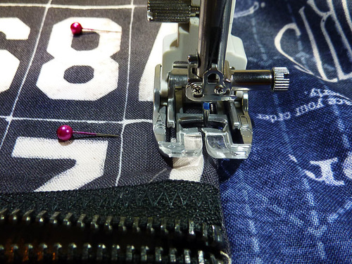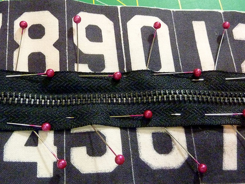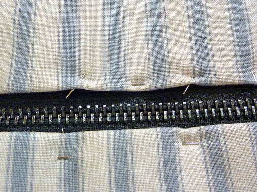 - Stitch along either side of the zipper through all the layers, removing the pins as you go.