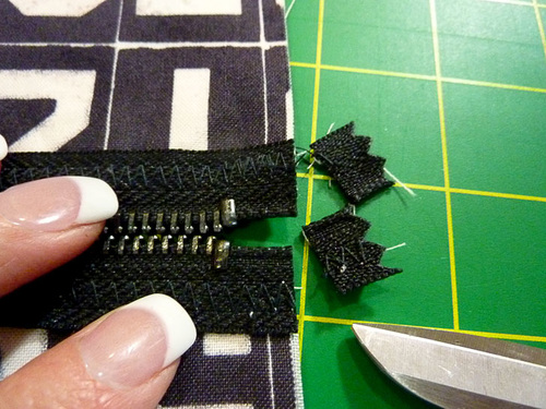 NOTE: As with all zipper insertions, when you feel you are approaching the zipper pull, stop with your needle in the down position. Raise the presser foot and twist the layers slightly so you can access the pull to move it out of the way of the presser foot. Once clear, drop the presser foot, re-position the layers, and finish the seam. - Trim any excess zipper tape flush with the side of the pocket panel.