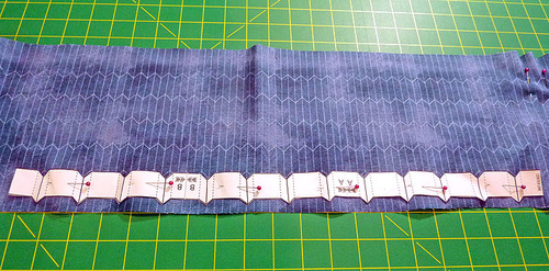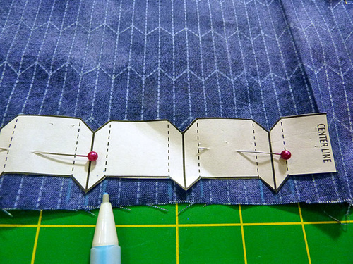 - Unfold the fabric right side up, place the Template at the center line and pin it in place.