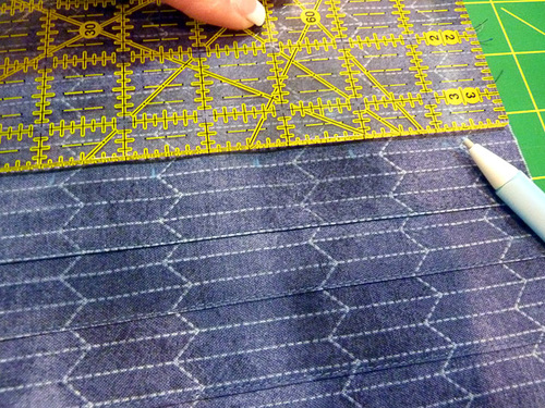 - From the fabric for the bottom accent band (Chalk Lines in our sample), fussy cut ONE WOF (width of fabric) x 7” high rectangle – the fussy cut is to insure all the “chalk lines” motifs on the fabric are straight and true.