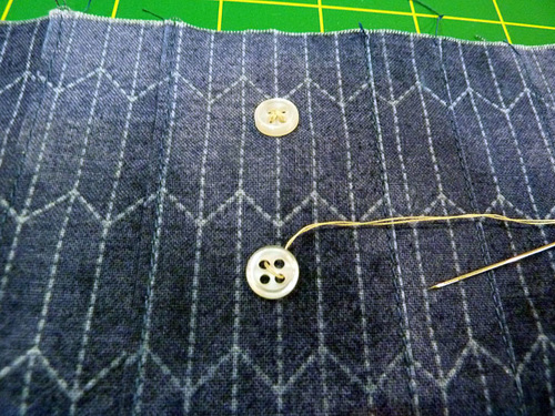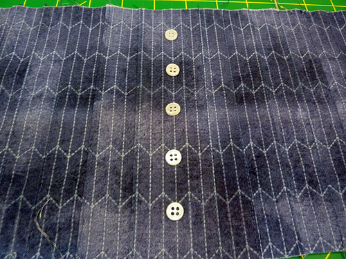 - Hand stitch each of the five buttons in place with matching thread in a traditional X pattern.