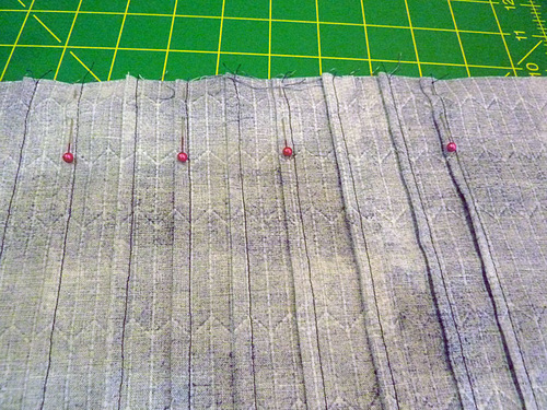 NOTE: Remember, you are working on the right side of the fabric. Make sure you use a marking tool that will easily wipe away or will vanish with exposure to the air or the heat of an iron. - In each trio of marked lines, there is one center line (the edge of the fold) and two outer lines (that come together, pinching the fabric to create the pleat).