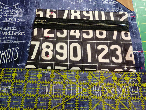 - Place the zippered pocket front and plain back right sides together (Numbers to Numbers). Pin first along the sides to secure the zipper. Then open the zipper and continue pinning around the rest of the pocket.