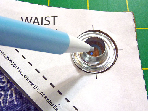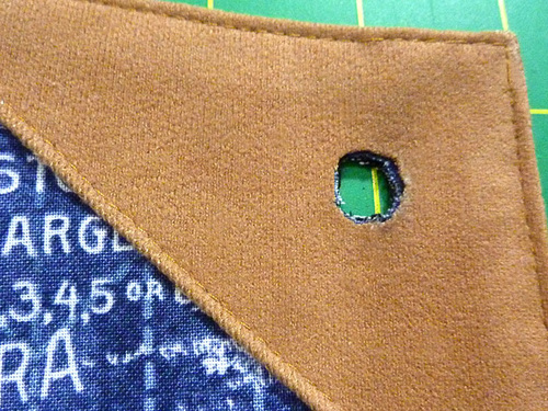 - Find the original corner patterns (waist and bib). Trim along the seam line of the two outer edges, then cut out the hole of the eyelet position.