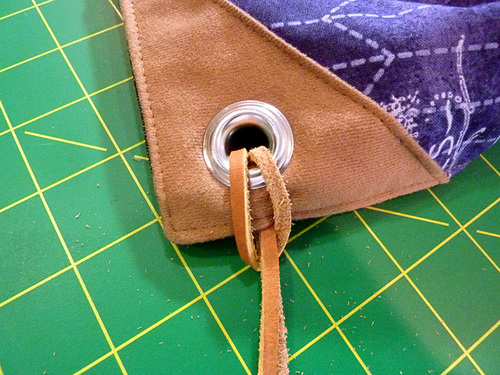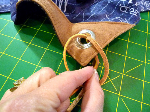 NOTE: If you are brand new to setting metal eyelets (grommets), it’s easy! Check out our full step-by-step tutorial. - Find the 60” length of lacing. Double it and slip the looped end through the left bib grommet.