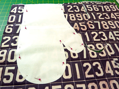 - Using the assembled oven mitt pattern, cut ONE with the pattern facing right side up and ONE with the pattern facing right side down. In other words, you need the thumb facing in opposite directions so that when you place the layers right sides together, the thumbs will align.
