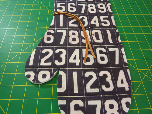- Find the leather lacing. Fold it in half. Place the loop on the thumb side of one mitt layer, flush with the raw edge. The lacing should sit 3” down from the top raw edge of the mitt. Pin the loop in place. You may also want to pin the tails in place at the center of the mitt so they stay out of the way of the perimeter stitching.