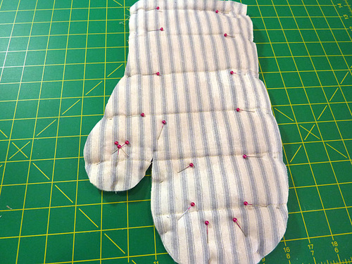 - Bring the binding up and over the raw edges. The folded edge of the binding should now be to the inside of the mitt and should cover the previous seam line. Pin in place.