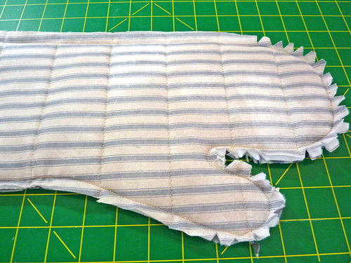 - Using a ½” seam allowance stitch through all the layers around the top of the mitt. Start and stop your seam at one of the mitt’s side seams.