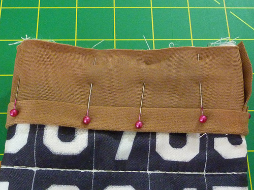 - Working first with the pocket front (the slightly taller set), layer the interfaced front and the lining wrong sides together. All raw edges should be flush.