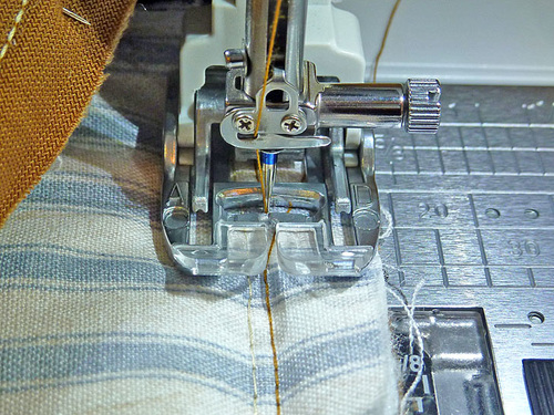 - Re-thread the machine with thread to best match the exterior fabric in the top and to best match the lining fabric in the bobbin. Lengthen the stitch.