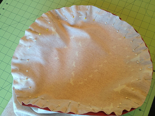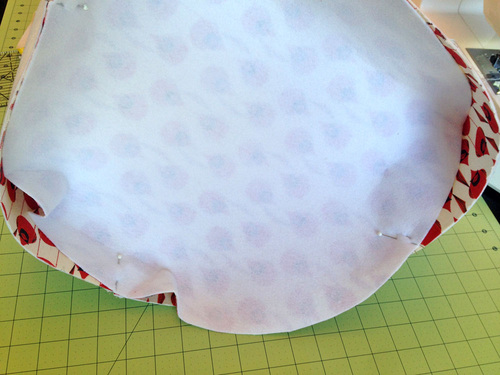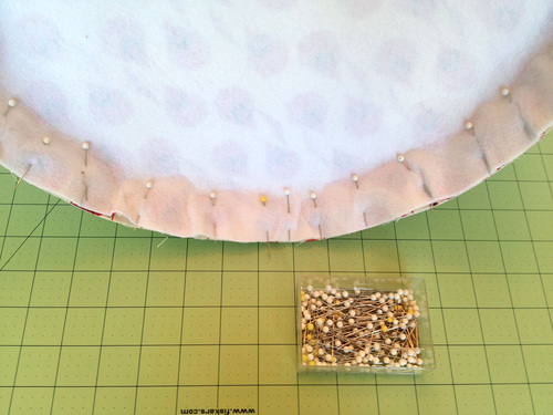 - Pin at the quadrant points first, then fill in around the circle. Don’t be afraid to use a lot of pins in order to get the two pieces to lay flat against one another.