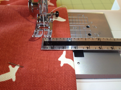 NOTE: Our Janome machine has great plate markings and we were able to use the 1″ guide on the plate to keep our seam straight. If you do not have a 1″ plate marking, you might want to consider measuring and drawing in a guideline with a fabric pen or pencil.