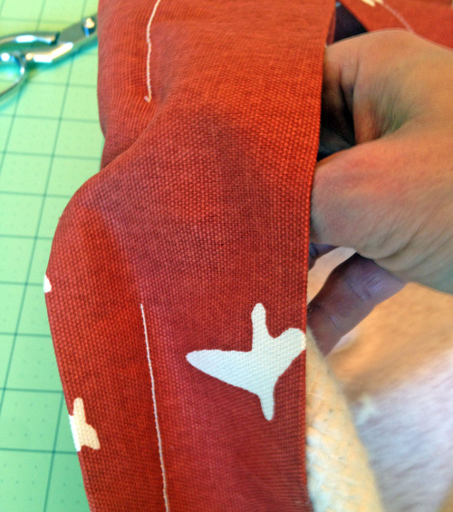 - Thread the cording all the way through. When it comes out the opposite side of the opening, butt together the two raw ends and lay the piping down against the fabric. If ring of cording doesn’t lay flat, trim away a bit from one side until it does.
