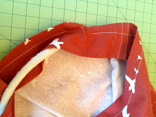 - To form the casing tunnel, stitch 1″ away from the top folded edge, leaving a 2″ – 3″ break in the seam to insert the cording.