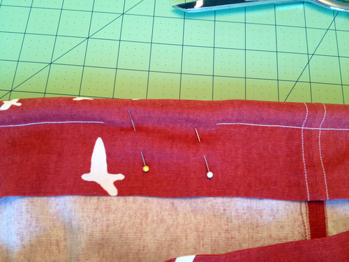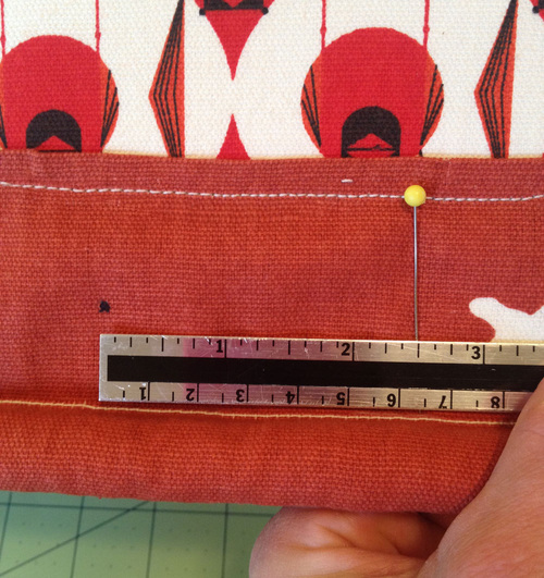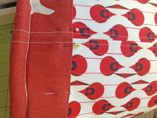 - Fold the top of the lining over the raw top edge of the exterior. The piping should fit snuggly against the top edge of the exterior and the bottom folded edge of lining should extend another 2″ over the exterior. At each side, be VERY careful to line up the topstitching on the lining with the topstitching on the exterior as shown in the photo below. Pin in place, using LOTS of pins.