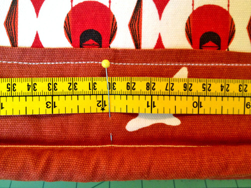 - Measure to find the exact center point along the top lining panel on each side. Remember, the topstitched seams are designed to be the actual front and back of the basket, so the handles will be opposite these seams. Fold the top of the basket together, matching the seams, where the basket folds to the left and right are the side center points. Mark these points with pins. If you want to be more precise, you can use a tape to measure from the center of each seam 11⅞” around to each side. Again, mark each side center point with a pin.