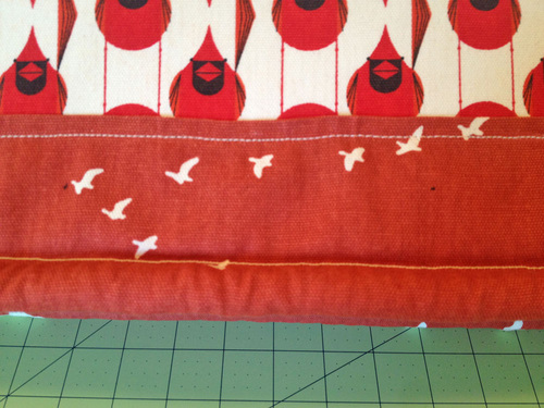 - First stitch the side seams and topstitch to either side. Remember to re-thread the machine with heavy thread in the top and bobbin for the topstitching.
