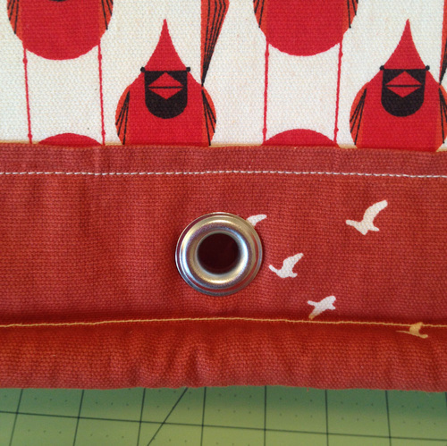 - Following the manufacturer’s instructions of our own great Sew4Home step-by-step Grommet Installation Tutorial, insert one grommet over each marked point.