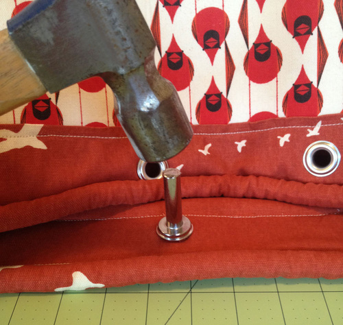 - You are inserting these grommets through some thick layers. Don’t be afraid to whack that hammer with purpose. It’s a great way to take out some frustrations! And as mentioned above, hammer on a very hard surface.