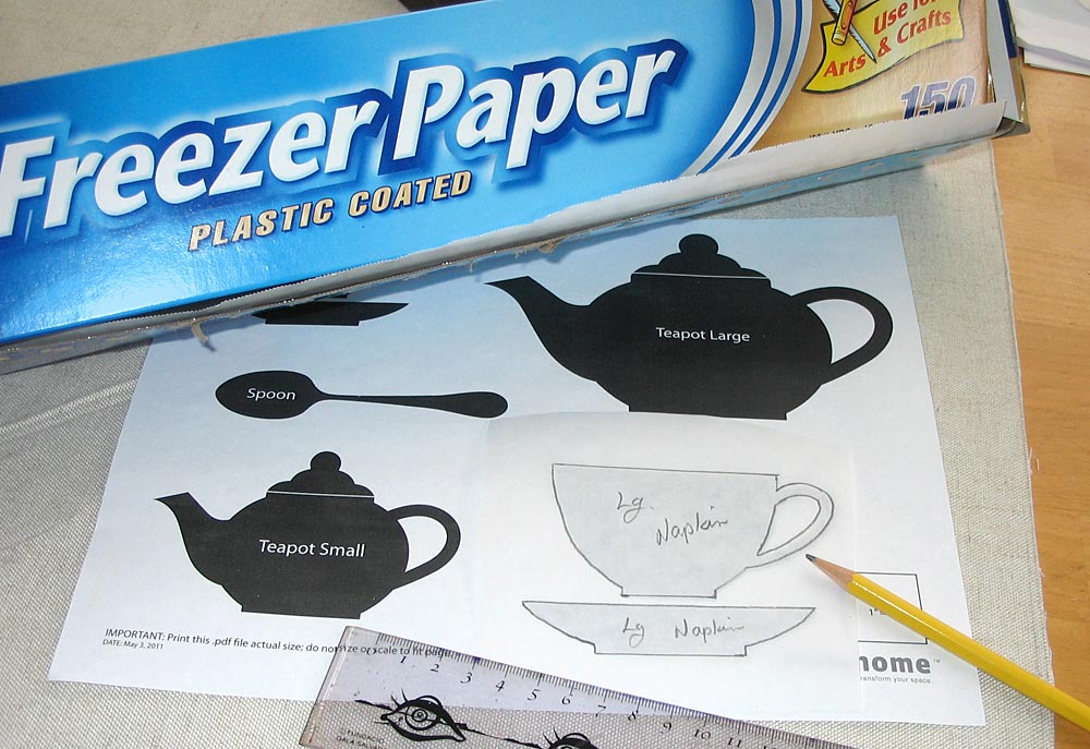 - Place the freezer paper onto the right side of the layer cake (you should have already applied the fusible web to the back of each layer cake). This step enables you to place the image exactly where you want it on the print of the fabric, important for the look of our Tea Time Kitchen Appliqué designs.