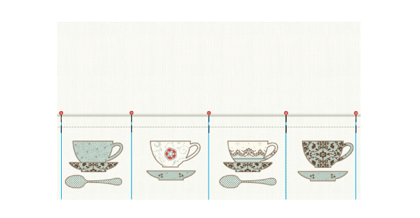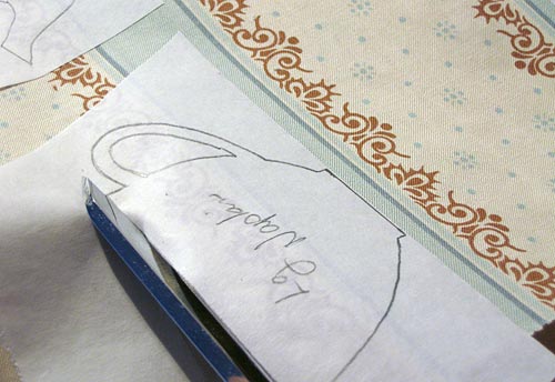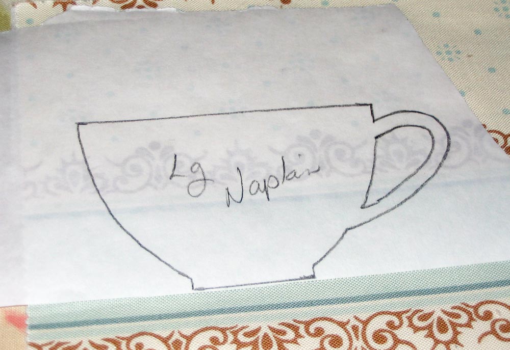 NOTE: To remove the paper backing, it can help to use small, sharp scissors to make a small score line in the paper. Just a very light scratch. It gives you an easier place to lift and pull away the paper. Trying to peel the fabric away from the paper at the edges can cause your fabric to fray. - Position your appliqué tea cups, saucers and spoons in the centers of each pocket section. Follow our diagram or create your own.