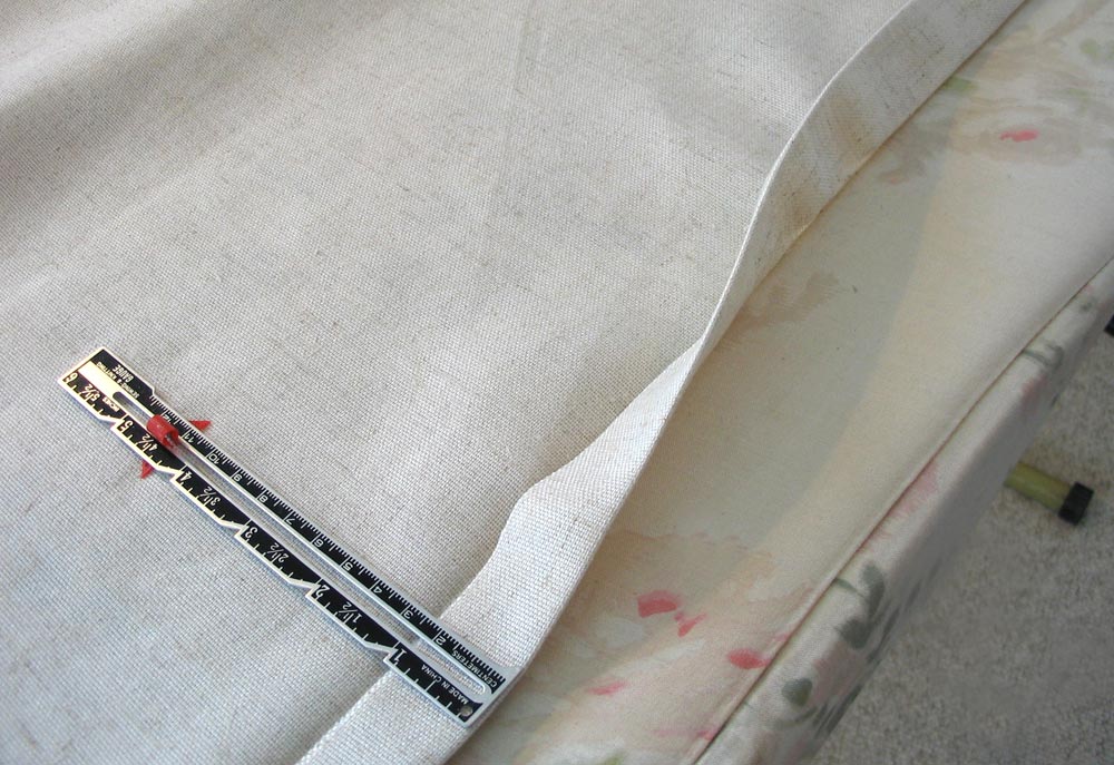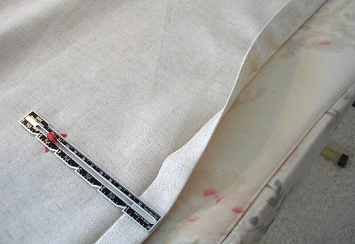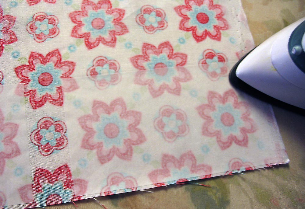 - Back to the ironing board one more time. This time to press the remaining raw edge into a ¾” double-fold hem. To do this turn back ¾” and press, then turn back another ¾” and press again. Pin in place.