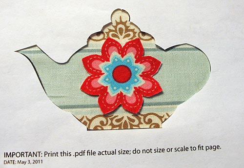 - If you follow our design, don’t forget that you need to overlay and stitch the large star flower appliqué in the center of the tea pot.