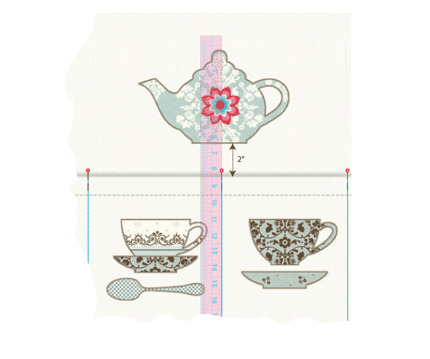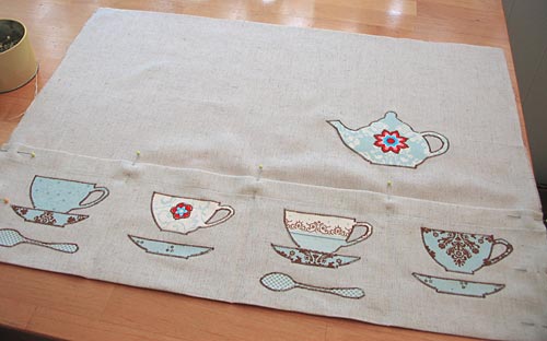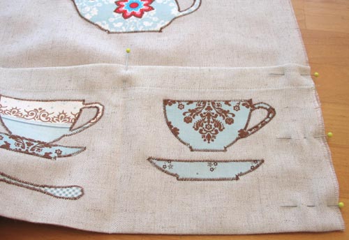 - Position the teapot appliqué so it is centered over the rightmost pocket division and approximately 2″ from the top of the pocket. Adhere in place.