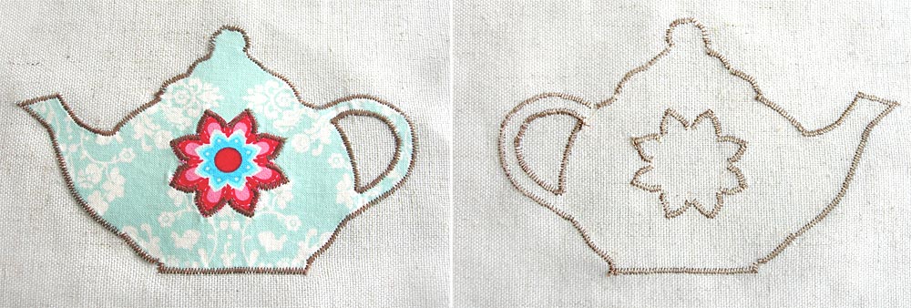 - Below is a close-up of the front and back appliqué of the teapot to show that we did the outside stitching as well as the ‘second level’ stitching at the same time. You can do the overlay first and then just appliqué the main body of the teapot or follow our technique.
