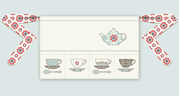 - If you follow our design, don’t forget you need to first overlay and stitch the small rounded flower appliqué on the the teacup to the left of center.