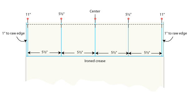 - Using pins or a fabric pencil, and following your crease, mark your center line. Measure 5½” to the right of center and draw a parallel vertical line. Then measure 11″ to the right of center and draw a parallel vertical line. The lines should extend from the hem to the horizontal crease, or you can simply place a pin at each measurement. Repeat to the left of center, drawing a vertical line or placing a pin 5½” to the left of center and 11″ to the left of center. You will use these divisions to both center your appliqués and stitch your final pocket divisions.