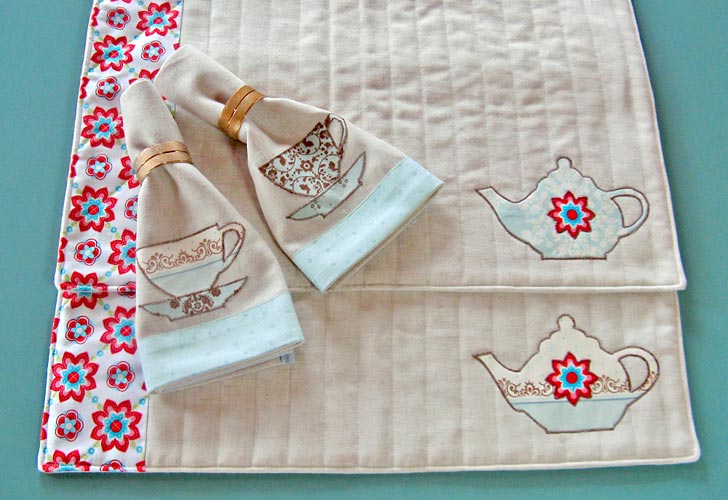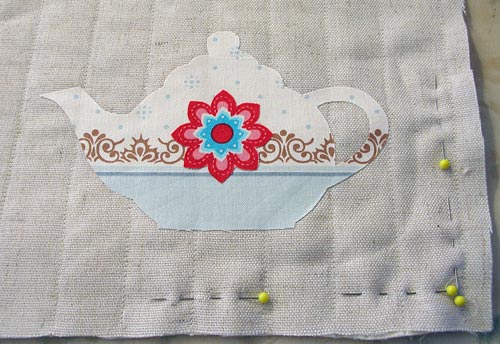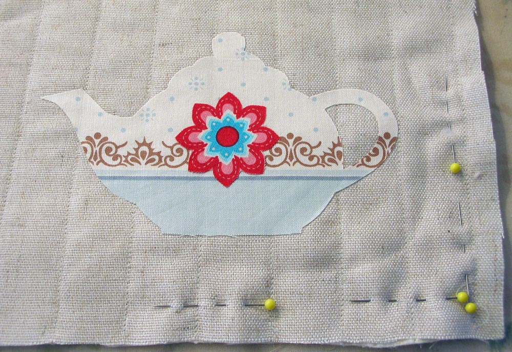 - For detailed step-by-step instructions, and options, for stitching your appliqués, see our Tea Time Apron tutorial. As mentioned above, remember you will first stitch your teapot appliqué in place and then stitch the second-level flower motif appliqué in place.