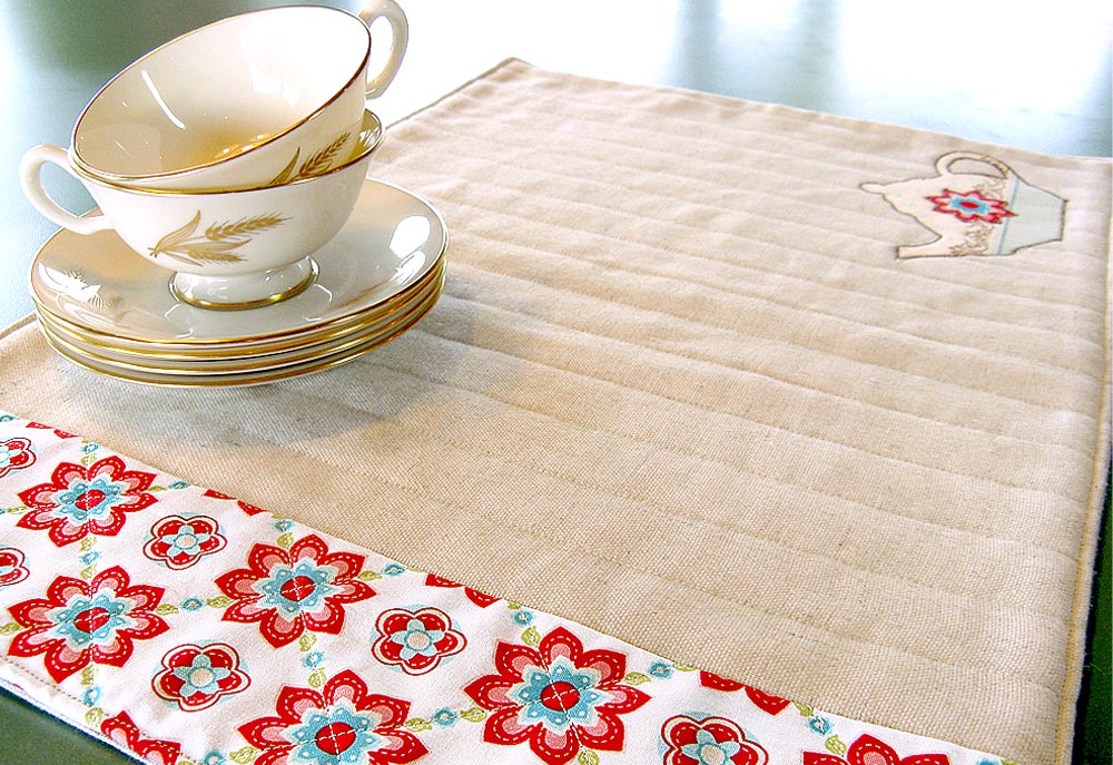 We love placemats, because they are such a versatile table setting option. You don’t need nearly as much fabric as you do for an entire tablecloth. In fact, with their smaller proportions, they’re a great way to bring together a number of colors, patterns and textures. Our table for two includes lovely quilted and appliquéd placemats. Their accent bands feature a diamond quilting pattern, while the main place-setting panels have repeating rows of parallel quilted stitch lines. Picking different styles of quilting within one project is a simple yet striking way to add a little spice. As with our other Tea Time projects, this one has a bold, double-layer appliqué highlight.