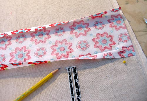 - Unfold the strip so you can see the creases. Place the strip, right side down on the base piece, aligning its left raw edge with the drawn line. In other words, your accent strip is to the inside of the line, facing towards the middle of the placemat not towards the raw edge.