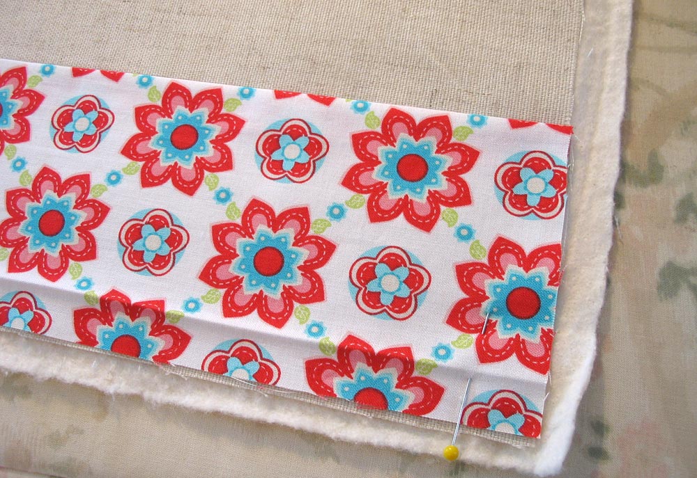 - We wanted out teapot appliqués to be positioned in the bottom right corner of each placemat. To figure out this positioning, remember to account for your ½” seam allowance at the raw edges. We placed pins at the ½” mark to help with positioning. You could also use drawn lines.