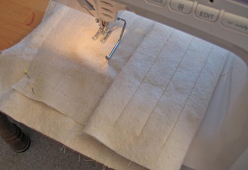 - With the accent strip quilted, the next step is to add parallel vertical lines of quilting across the base fabric of the front of the placemat.
