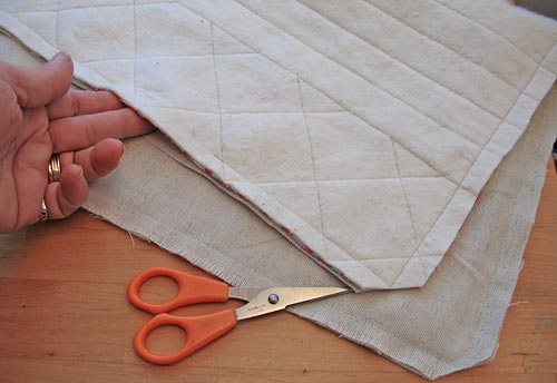 - Trim off the excess batting around all four sides of the placemat front so raw edges are flush (a rotary cutter and ruler is best for this step).