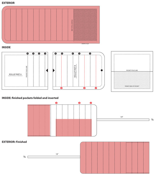 IMPORTANT: Each page in the PDF is ONE 8½” x 11″ sheet. You must print the PDF file at 100%. DO NOT SCALE to fit the page. Print horizontally (landscape). There is a guide rule on each page so you can confirm your final printout is to scale. The pattern is color-coded; print in color if possible. - Cut out each pattern piece along the solid line. The pattern for the main body of the Rollup is two pieces. Using the arrows printed on the pattern pieces, butt together (do not overlap) the two pieces. Tape together to create the full pattern.