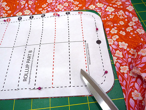- Flip over the Rollup so you are again working against the exterior where you can clearly see the original drawn guidelines. Stitch along each of the #2 drawn guidelines, removing the pins as you go.