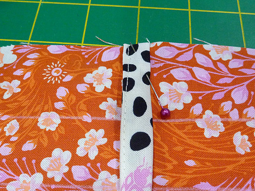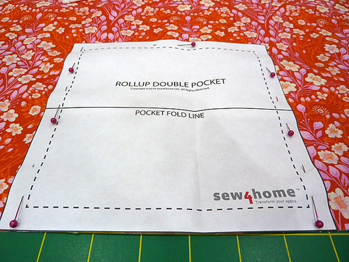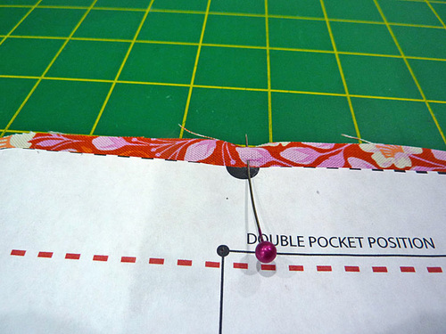 - Fold up the horizontal pocket into position and pin along both sides. You can grab the paper pattern again to double-check that the finished side edges of the pocket are still aligned with the #2 quilting guidelines. Press well.