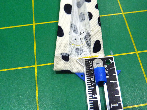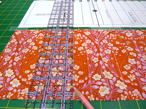 - Working on a flat surface – we used our cutting mat, place the pattern directly above your cut exterior panel. Make sure the pattern is directly above and exactly parallel with the fabric panel. Tape the pattern and fabric panel in this position.