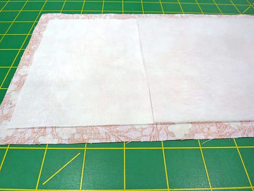 - Place the lightweight interfacing to the left and the fusible fleece to the right. Both the interfacing and the fleece should be centered so there is ½” of fabric showing beyond them around the outer perimeter. The two pieces butt together at the Pocket Fold Line. Following manufacturer’s instructions, fuse in place.