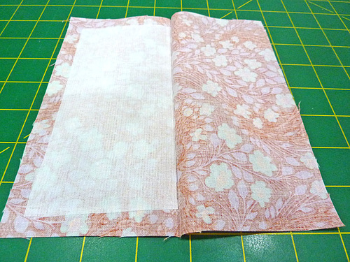 - Find the interfaced pocket panel. Re-fold it along the center crease line, but this time you are folding right sides together.