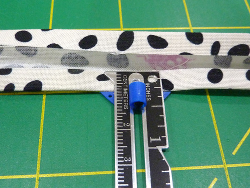 - From the fabric for the tie (Spots on Spots on our sample), cut ONE 1½” x 20” strip — we were extra careful to fussy cut so we could center the cute and colorful ladybugs.