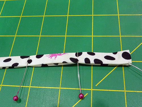 - Re-fold along the original crease line. The long folded edges and the folded edges of the one end should all be flush. Pin in place.