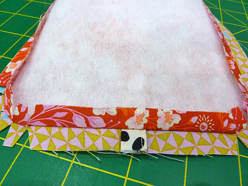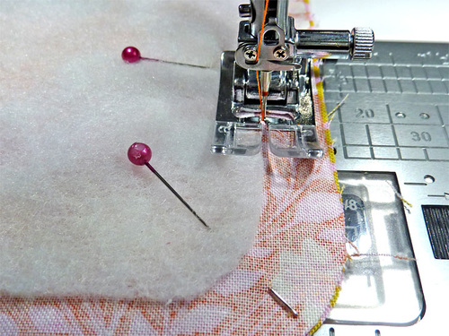 - Using a ½” seam allowance, stitch around the entire perimeter through all the layers. Remember to pivot at the sharp corners and to go slowly and carefully around the curved corners to keep them as smooth as possible. Some people like to shorten the stitch length to stitch around curved corners.