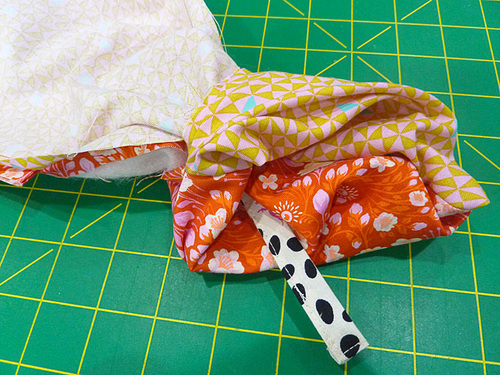 - Turn right side out through the opening at the bottom corner. Pull the inside horizontal pocket and the tie out and press them flat, away from the perimeter seam.
