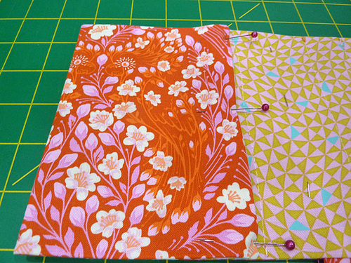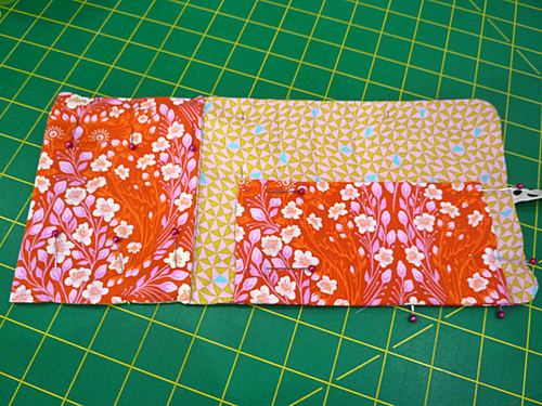 - Place the interior and exterior panels right sides together, sandwiching the tie and the horizontal pocket between the layers. The two layers should be flush around the perimeter. Pin in place, leaving an approximate 3” opening along the bottom corner on the side where the pocket will eventually fold over to the inside (the left side). In our photo below, you can see we used two pairs of double pins to mark our opening.