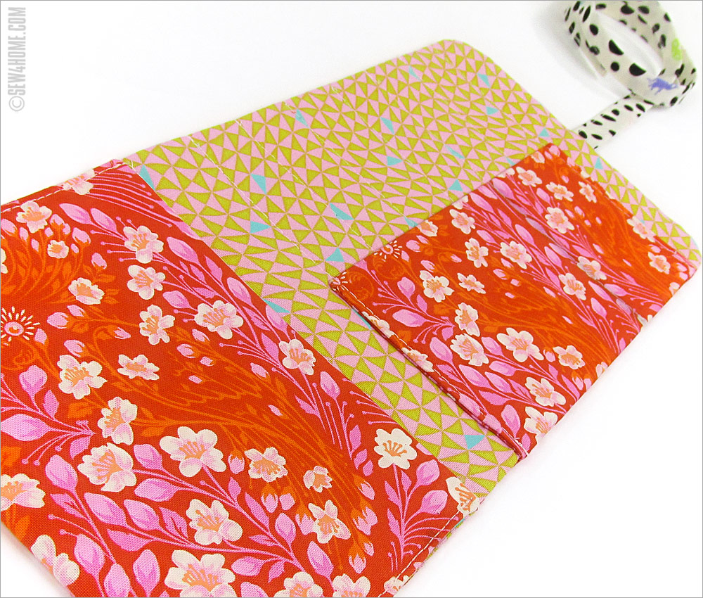 The Rollup uses just small cuts of three different fabrics, so it would make a good ScrapBusters project. If using Monkey Wrench, or any fabric with super cute motifs, we recommend taking the time to fussy cut the exterior panel as well as inside horizontal pocket. The Parrot Prattle fabric we chose for the exterior features subtle parrots centered on the main exterior panel as well as within the taller vertical pocket. It’s details like these that take your project from “okay” to “wow!”